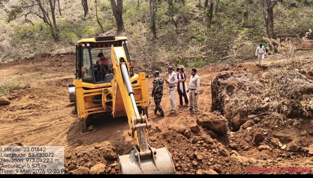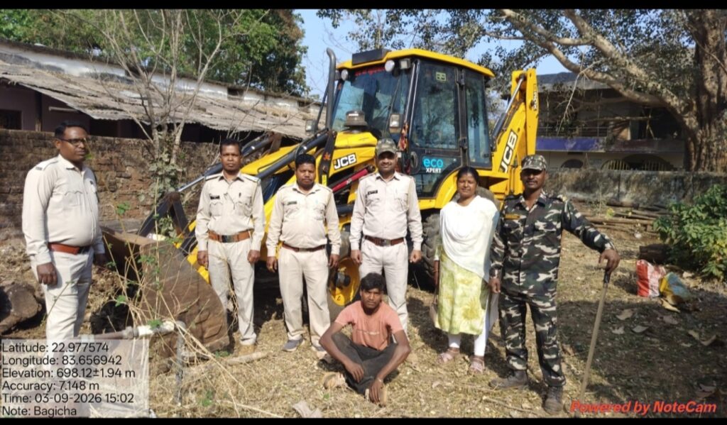 आज दिनांक 09.03.2026 को दूरभाष के माध्यम से सूचना प्राप्त हुई कि वन परिक्षेत्र बगीचा अंतर्गत ग्राम टांगरपानी के दालढोढ़ी नामक स्थान पर जे.सी.बी. मशीन के माध्यम से वनभूमि में खेत निर्माण कर अवैध कब्जा किया जा रहा है। सूचना प्राप्त होने पर वनमण्डलाधिकारी जशपुर श्री शशि कुमार, भा. व. से. के निर्देशानुसार वन परिक्षेत्राधिकारी बगीचा सुश्री यशस्वी मौर्य, प्रशिक्षु भा.व.से. द्वारा वन अमले के साथ तत्काल घटनास्थल दालढोढ़ी, कक्ष क्रमांक पी-1331 पहुंचकर जांच की गई। मौके पर जे.सी.बी. (न्यू) मशीन चेविस क्रमांक